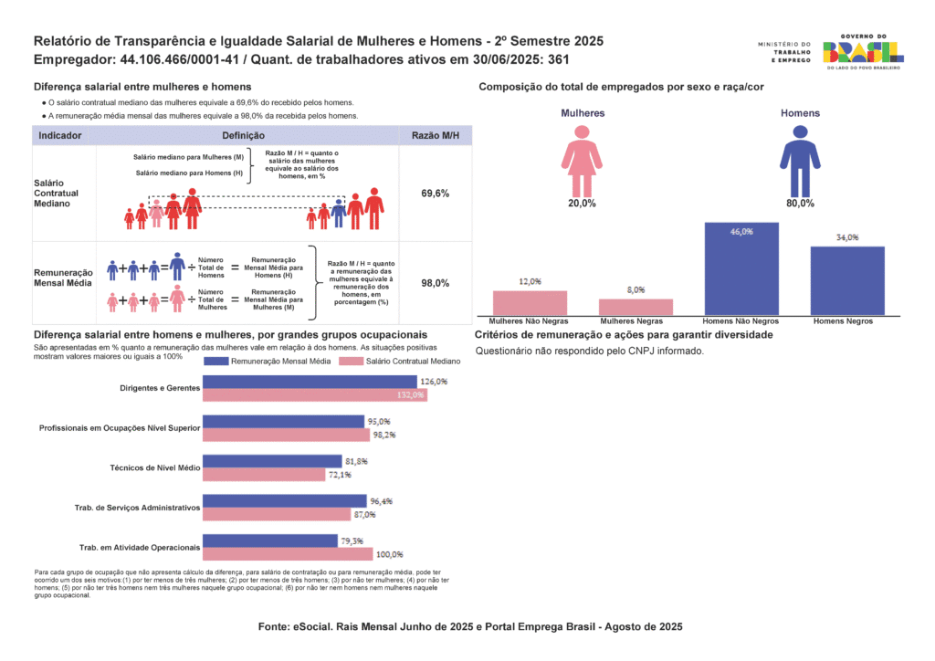 - O Relatório de Transparência Salarial e de Critérios Remuneratórios foi elaborado pelo Ministério do Trabalho e Emprego (MTE), com base em informações prestadas pela empresa no e Social e no Portal Emprega Brasil.